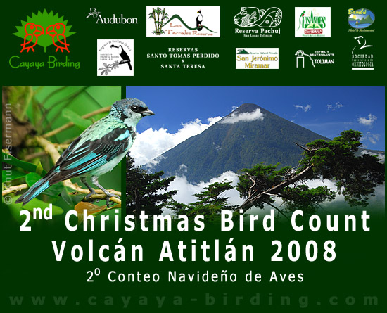 The second edition of the Christmas Bird Count at Atitlán Volcano took place on 14 December 2008. A total of 48 observers counted birds in Reserva Natural Privada Los Andes, Reserva Natural Privada Los Tarrales, Finca San Jerónimo Miramar, Fincas Santo Tomás Perdido & Santa Teresa, and Reserva Natural Privada Pachuj, and in the Santiago and Tolimán bays of lake Atitlán.