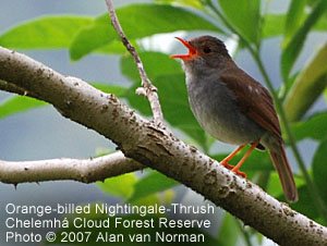 ORANGE-BILLED NIGHTINGALE-THRUSH: Several pairs had territories near the lodge. I had nice opportunity to photograph one in the lodge garden. Seen daily.